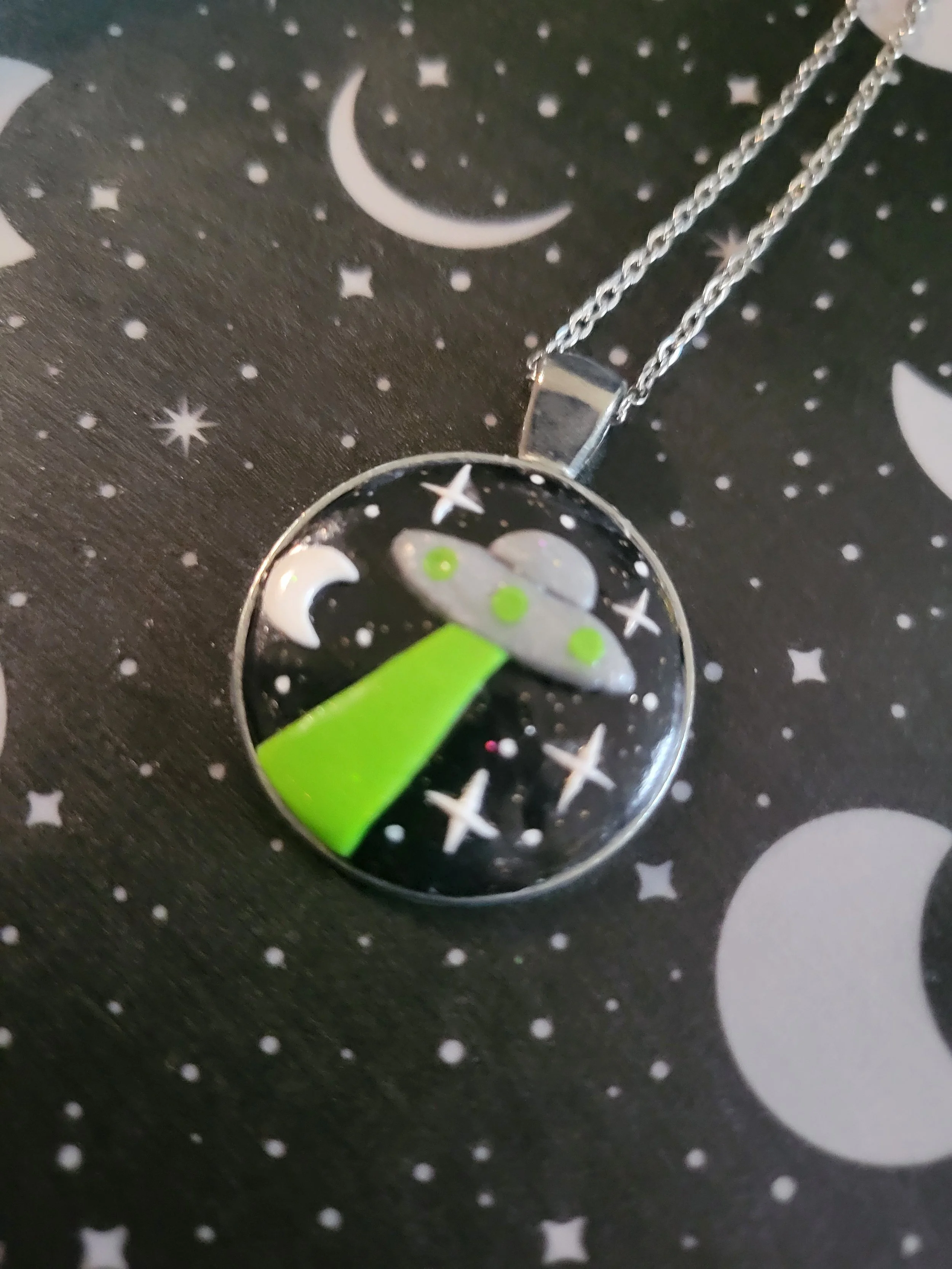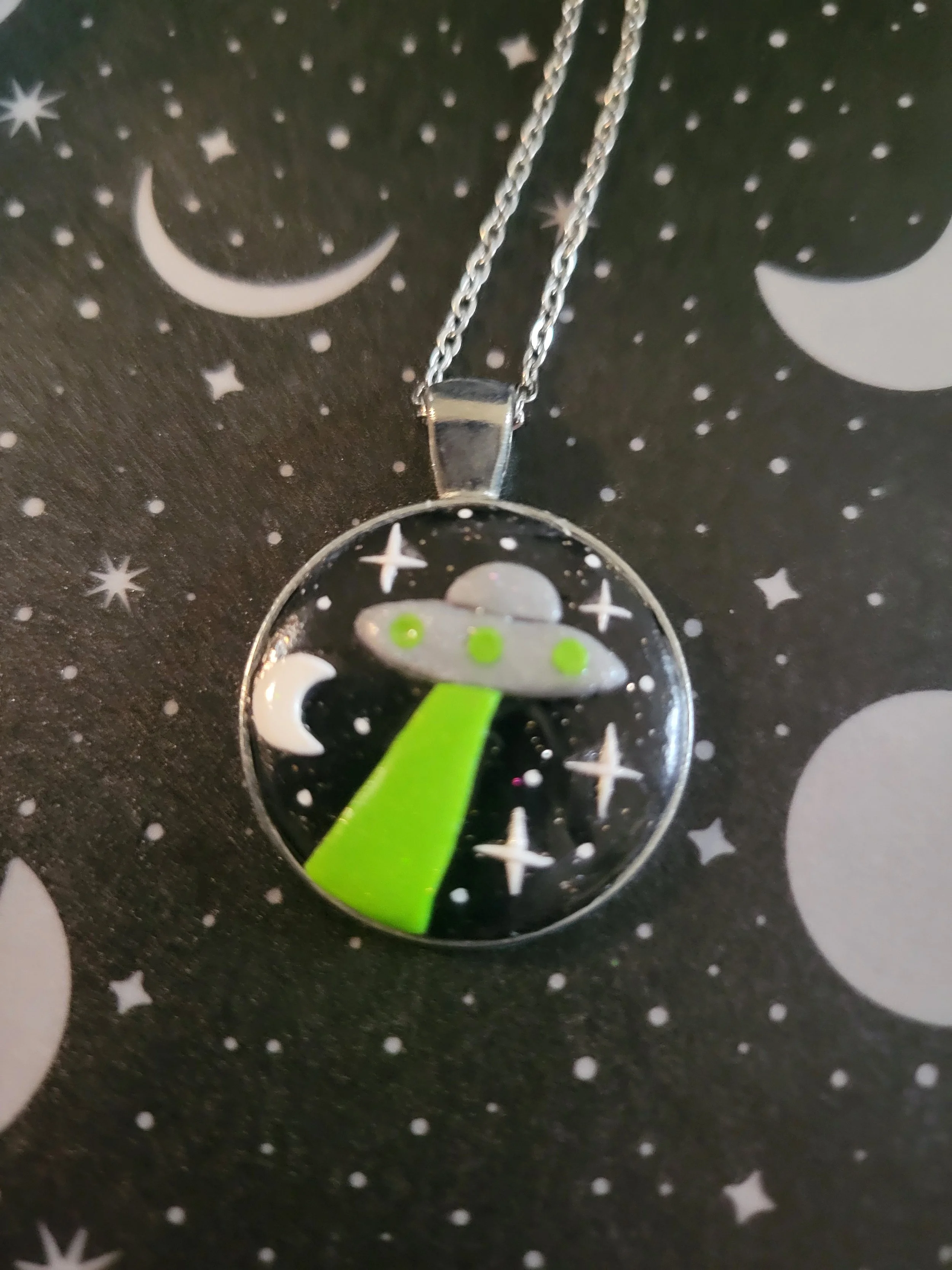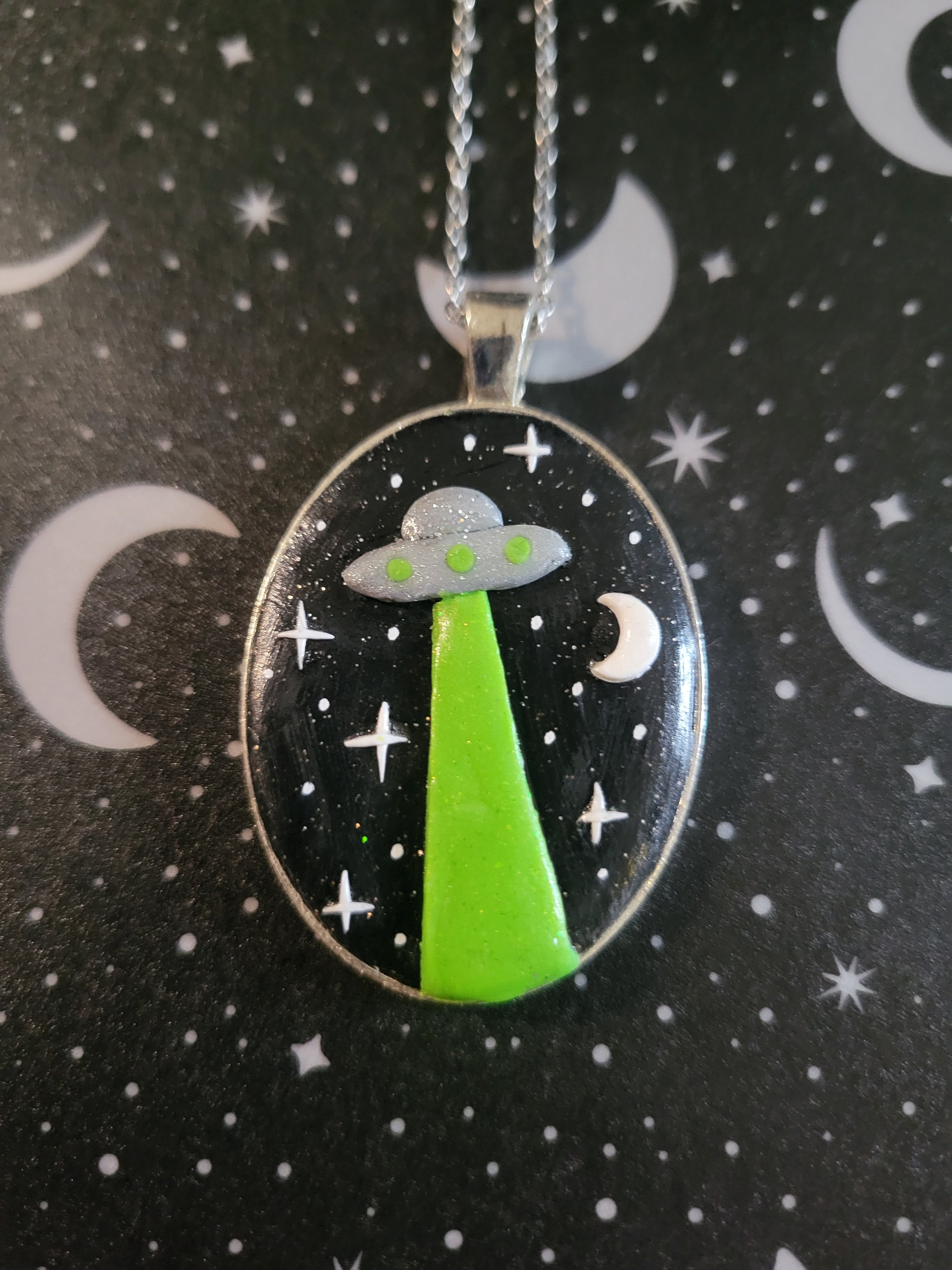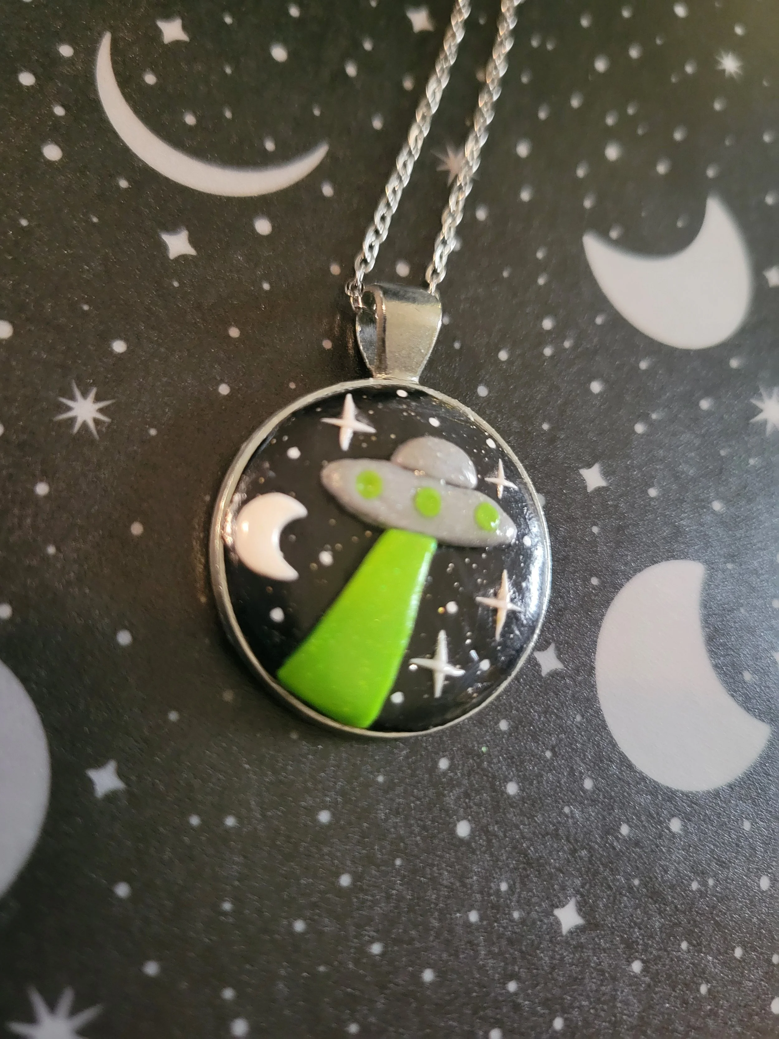 These moon pendants are made entirely from polymer clay inside a metal frame. Pleased note the material used to make the metal frames is an alloy and cannot be guaranteed to be nickel free.