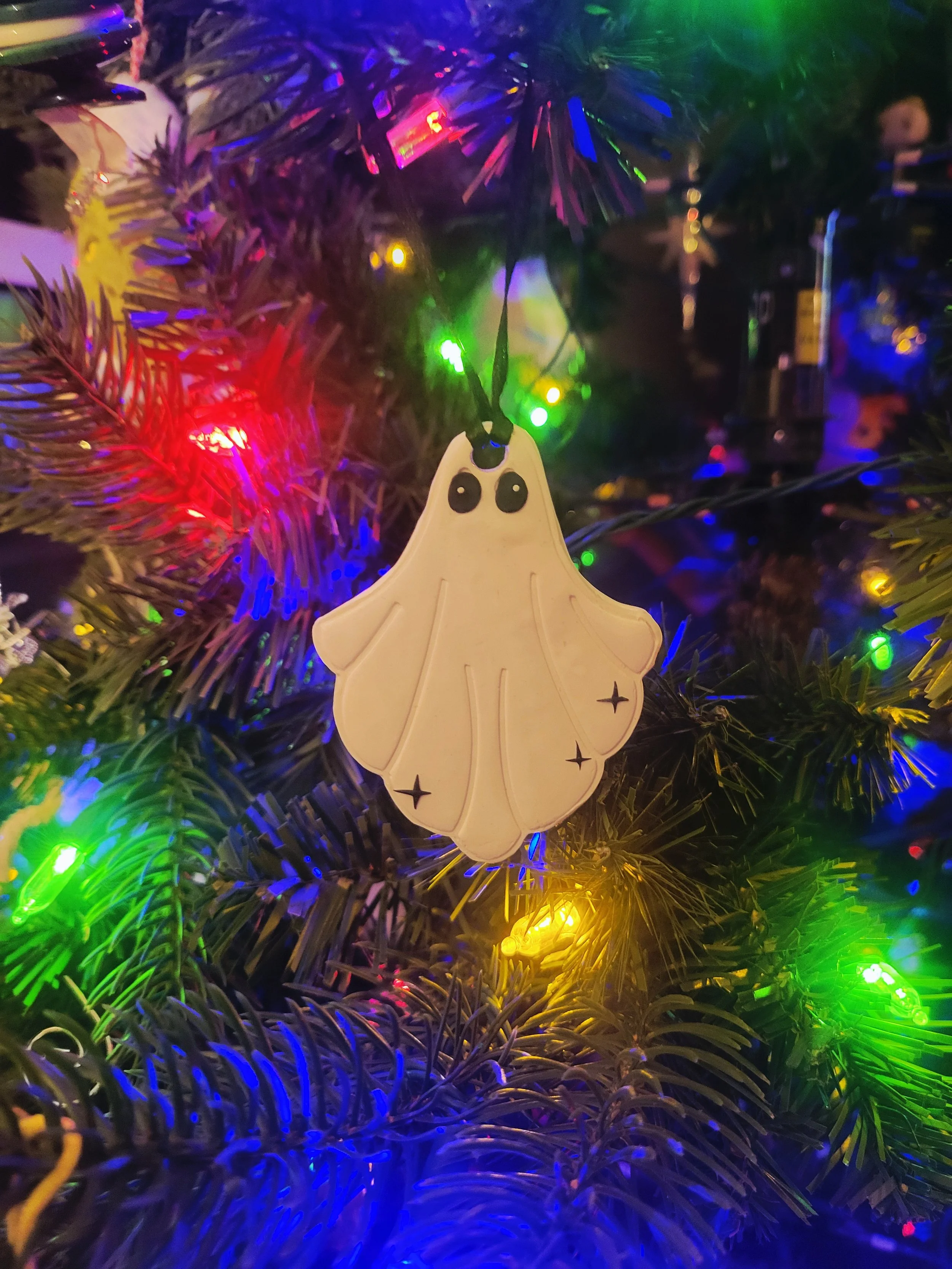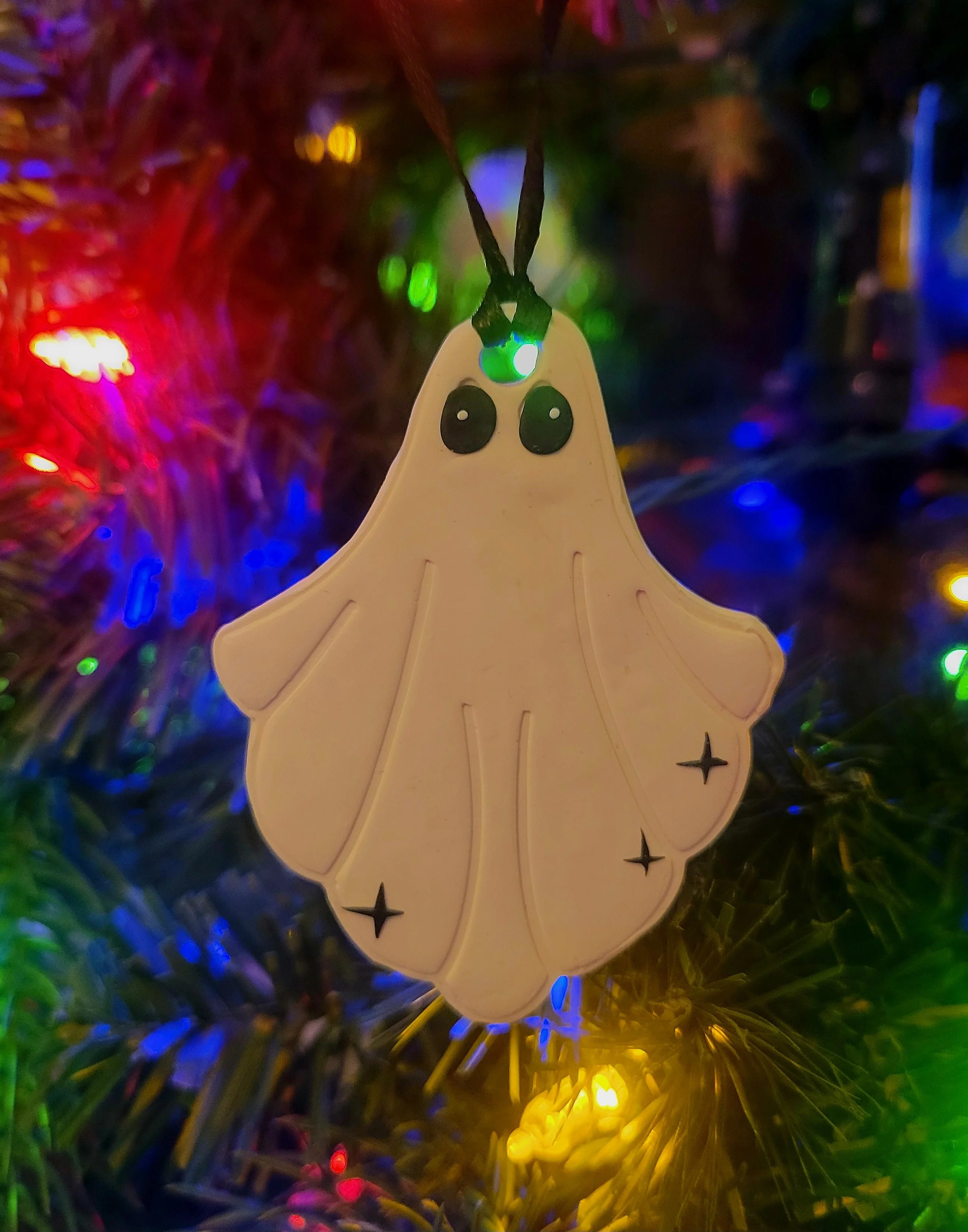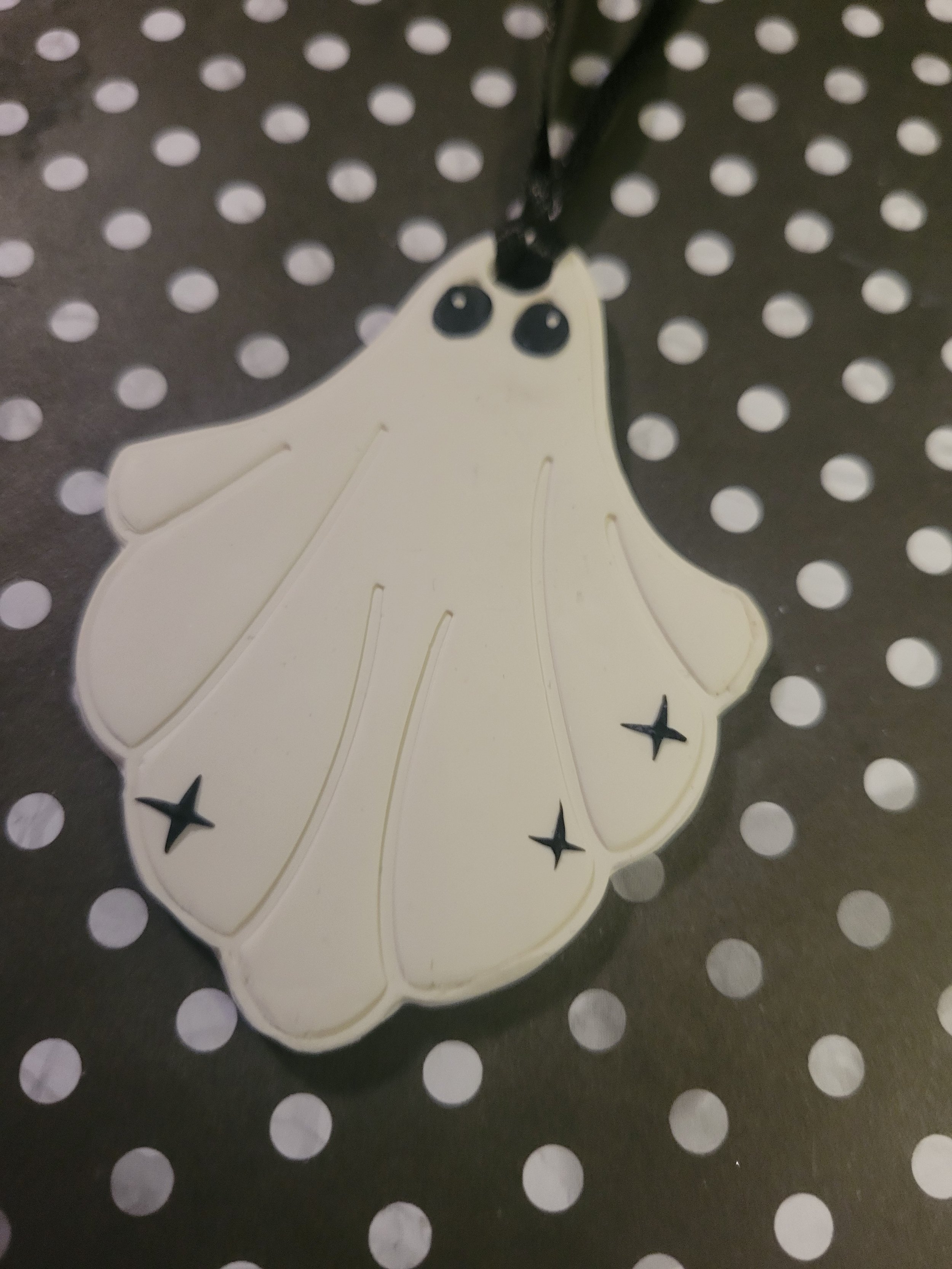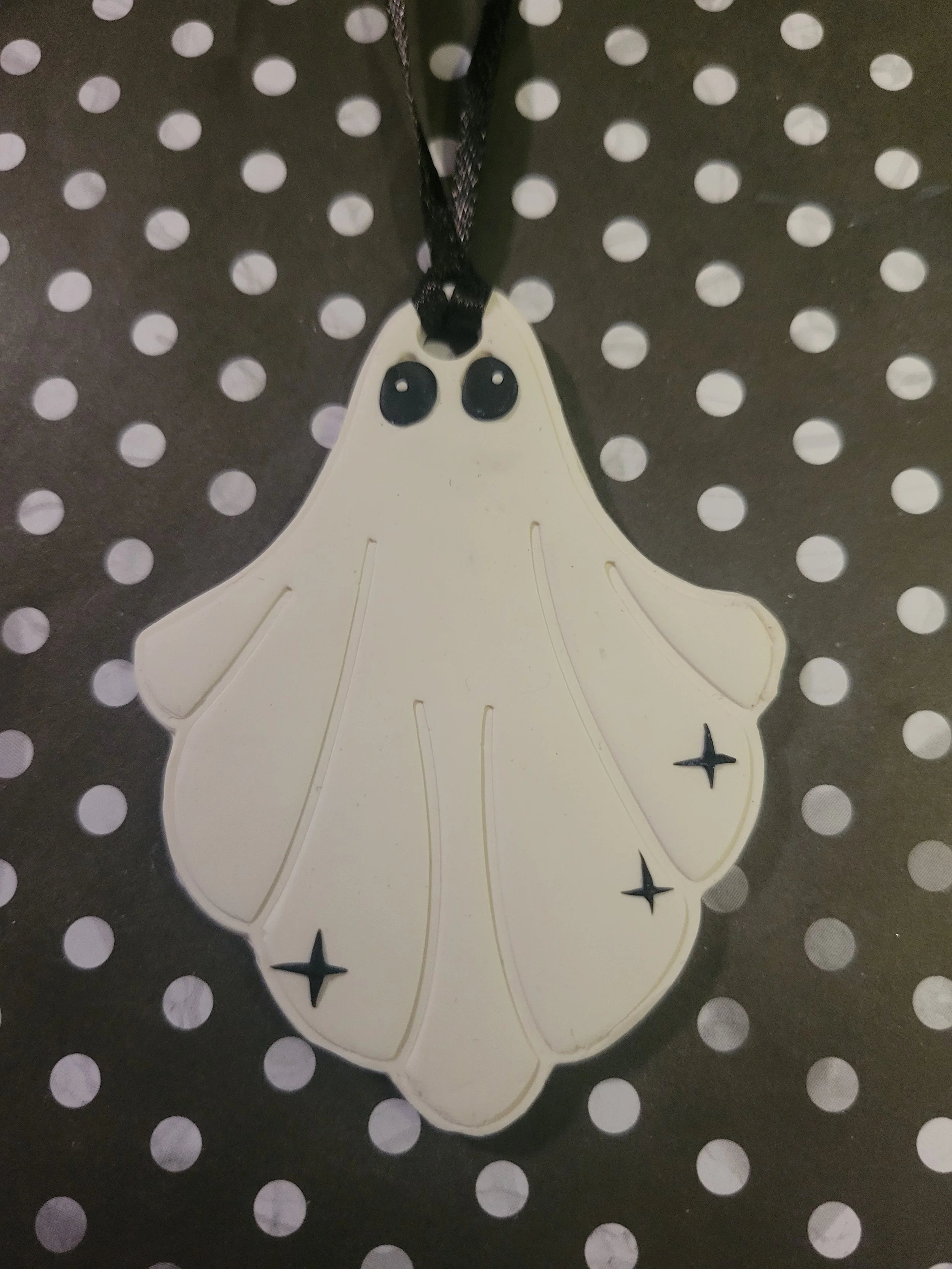 These little ghosts are handmade from polymer clay with little star details.