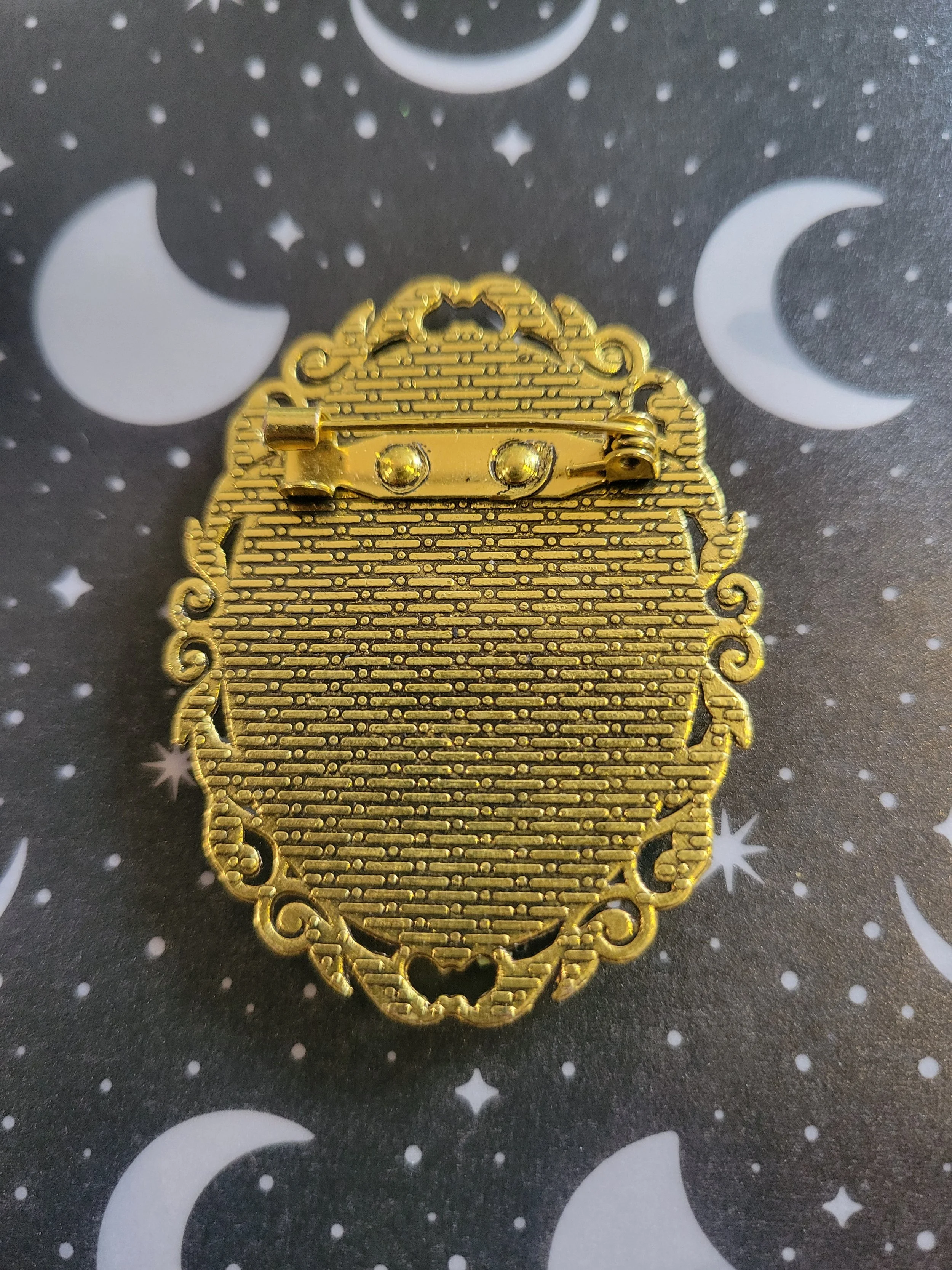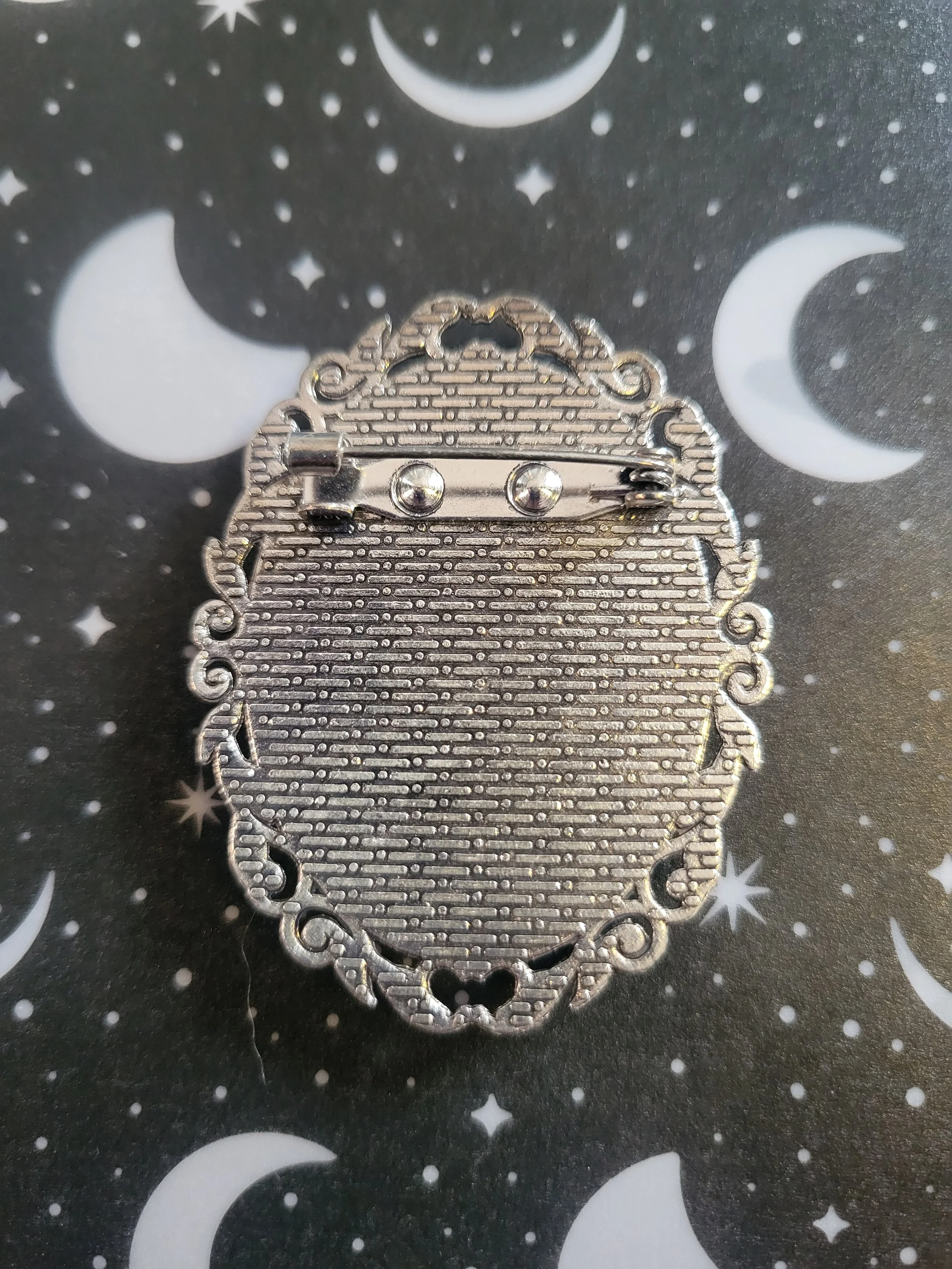 The frame colour will match the colour of the moon you choose. They measure 40mm x 50mm and are backed onto alloy metal ornate frames which have a safety pin style clasp.