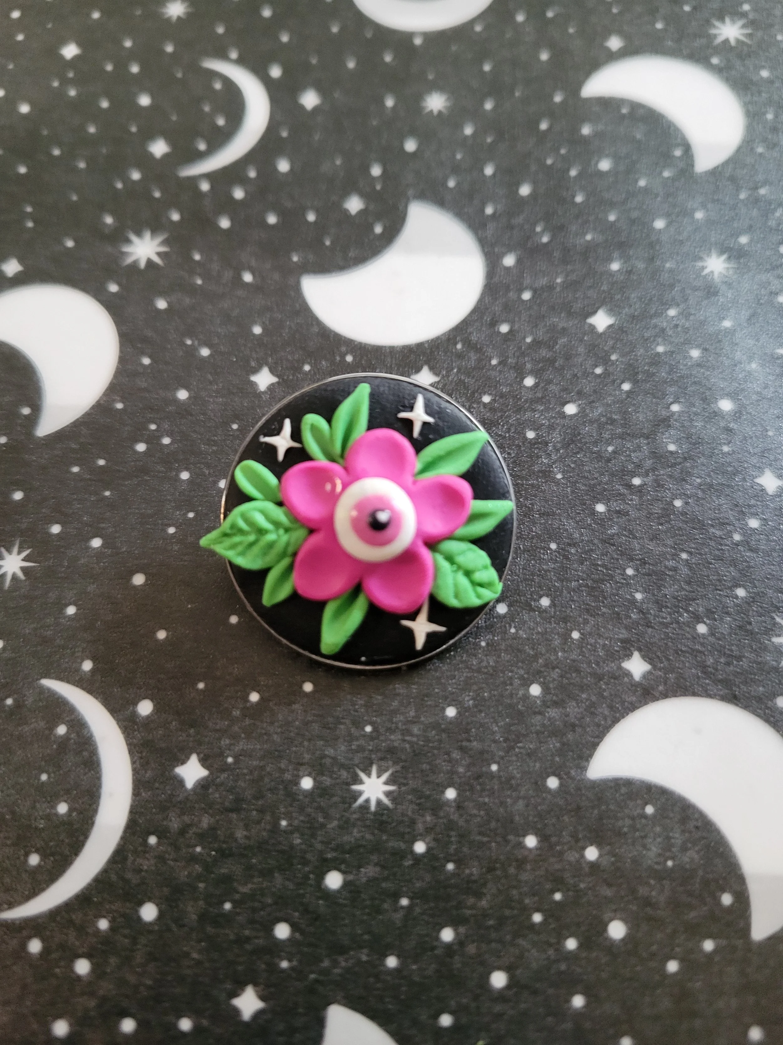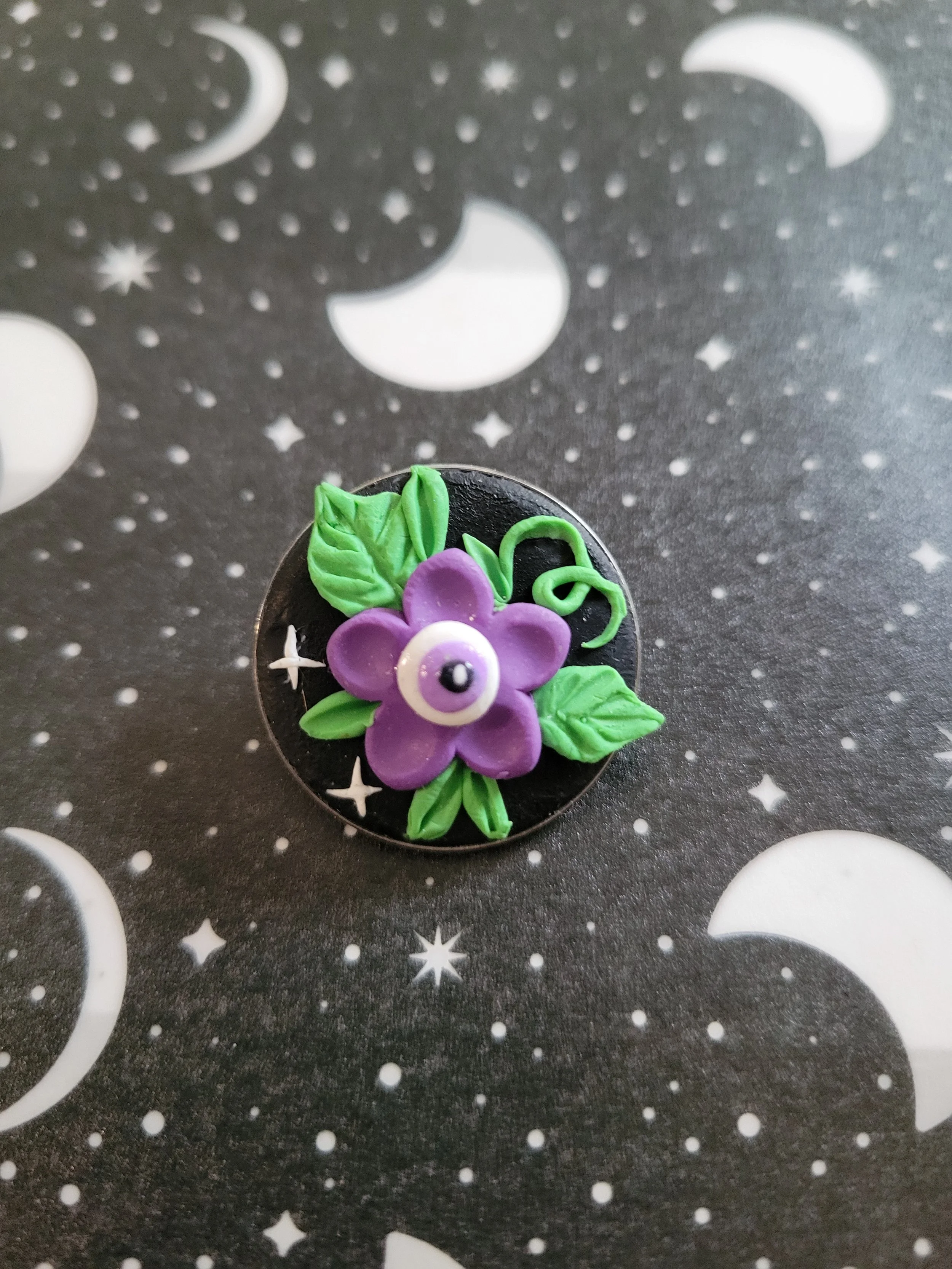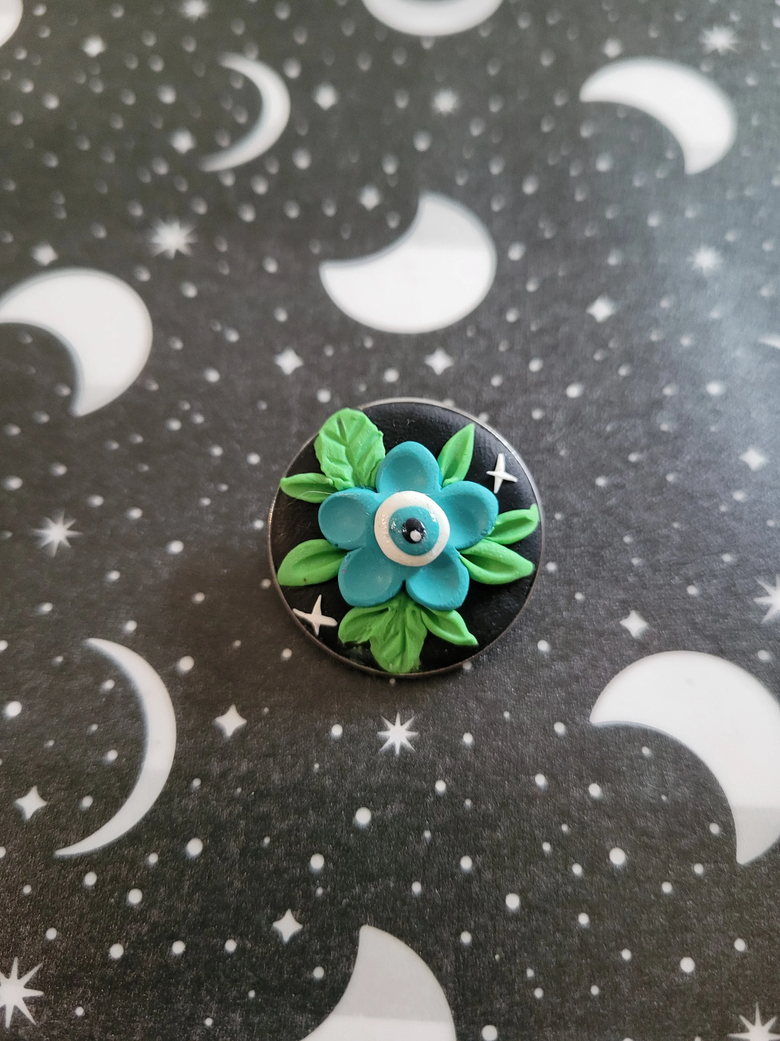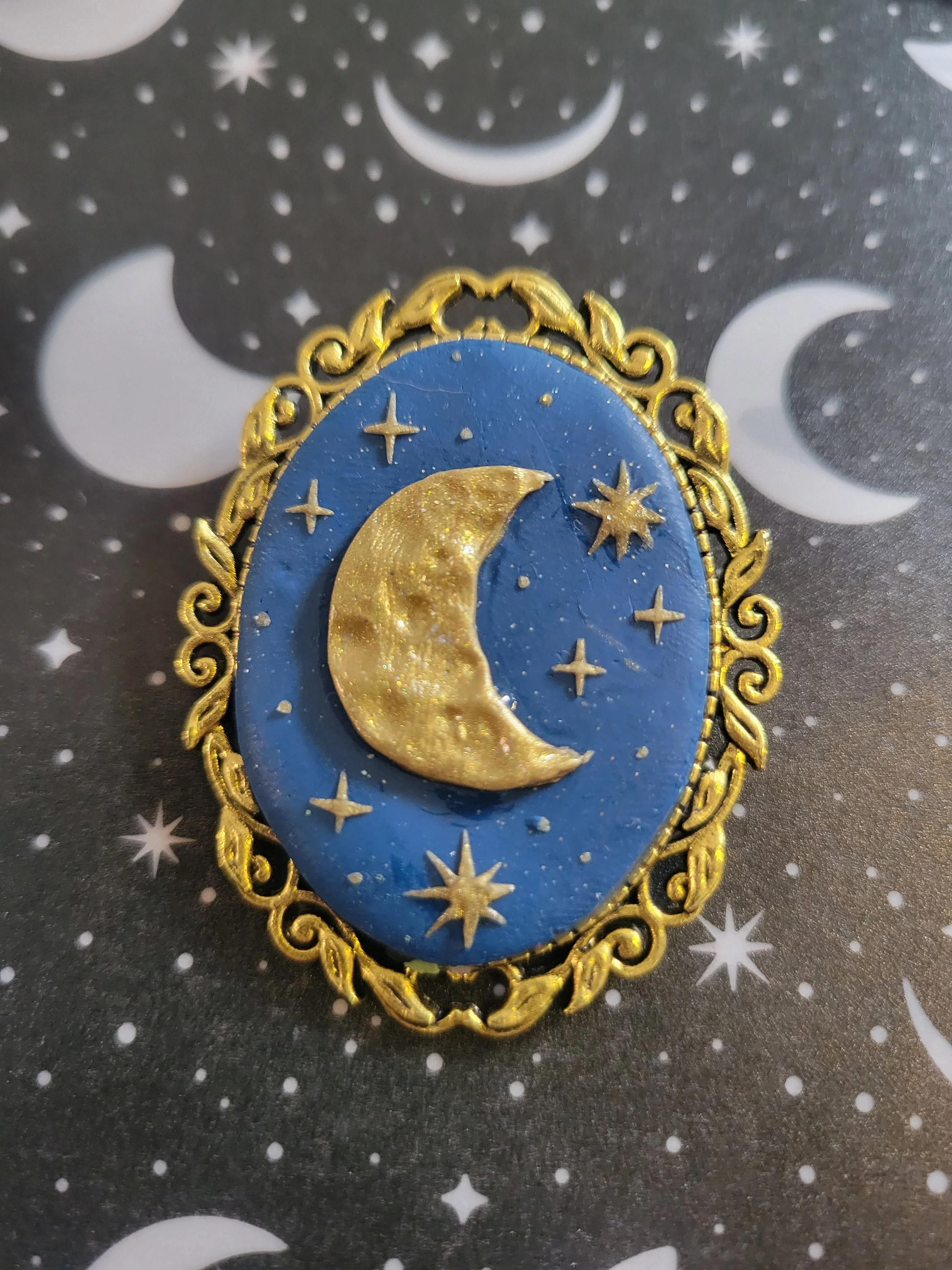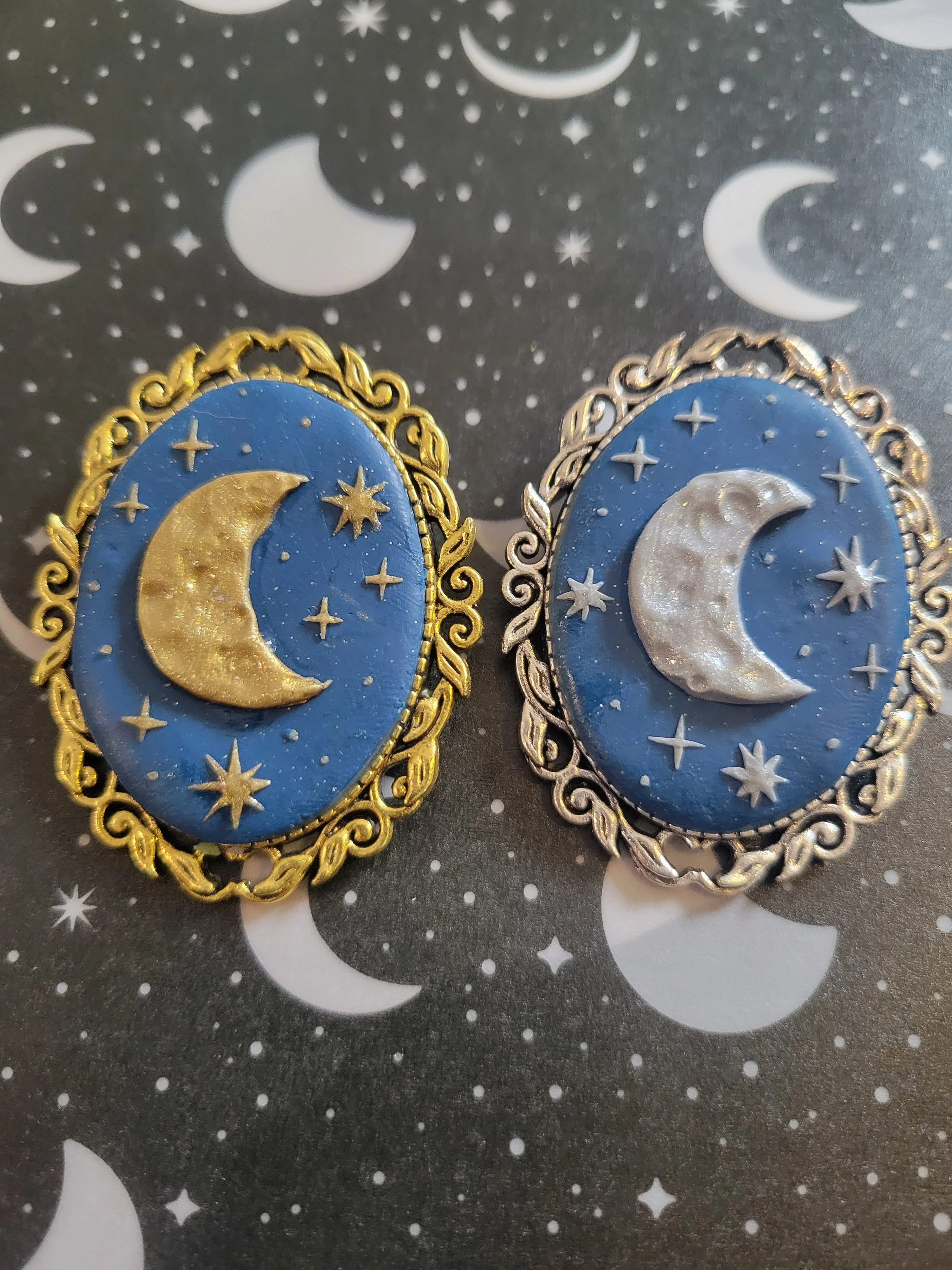 These moon brooches are made with silver or gold polymer clay which is set on a blue background with star details.