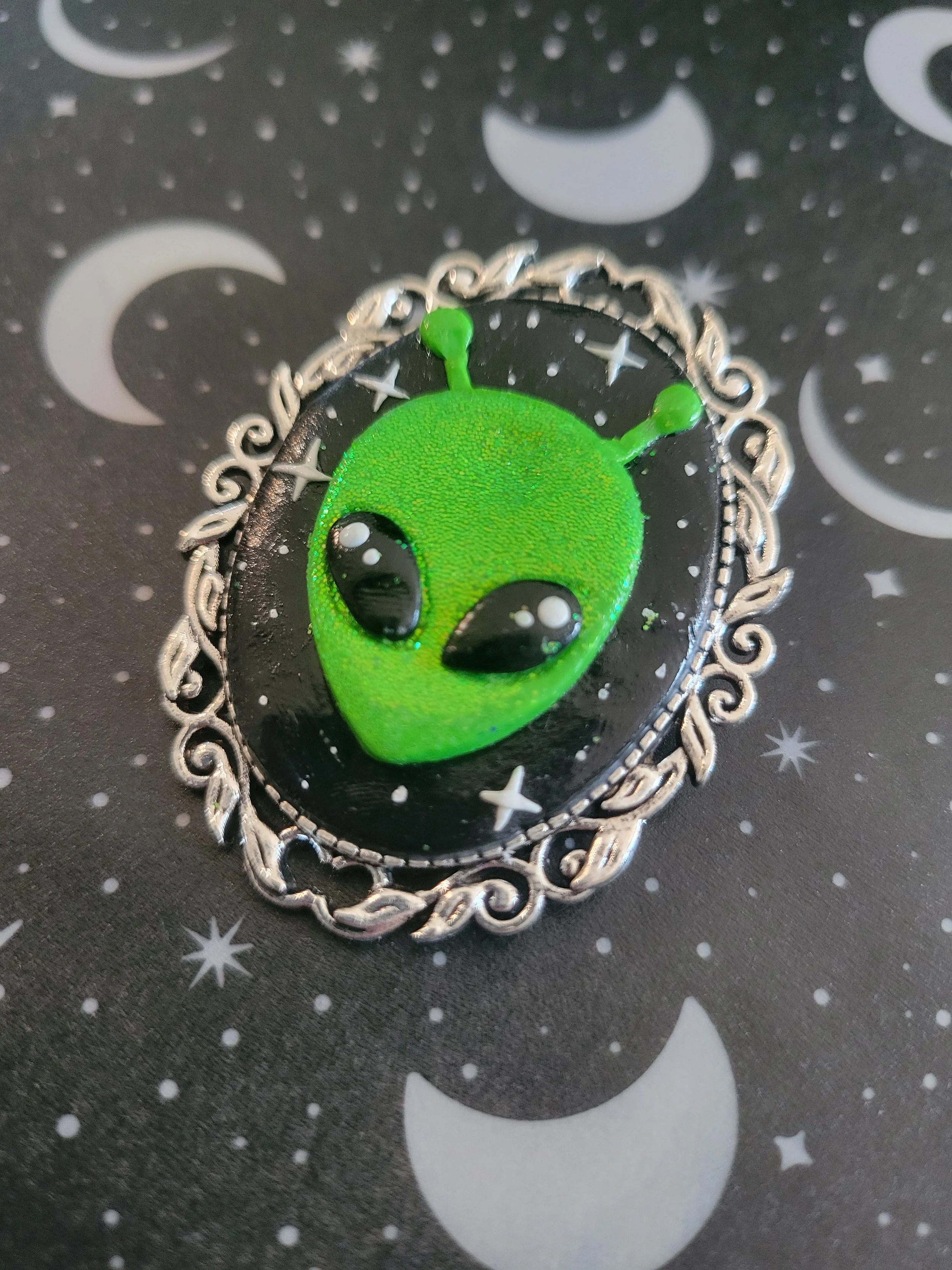 These litte alien brooches are made with polymer clay which is set on a black background with star details.
