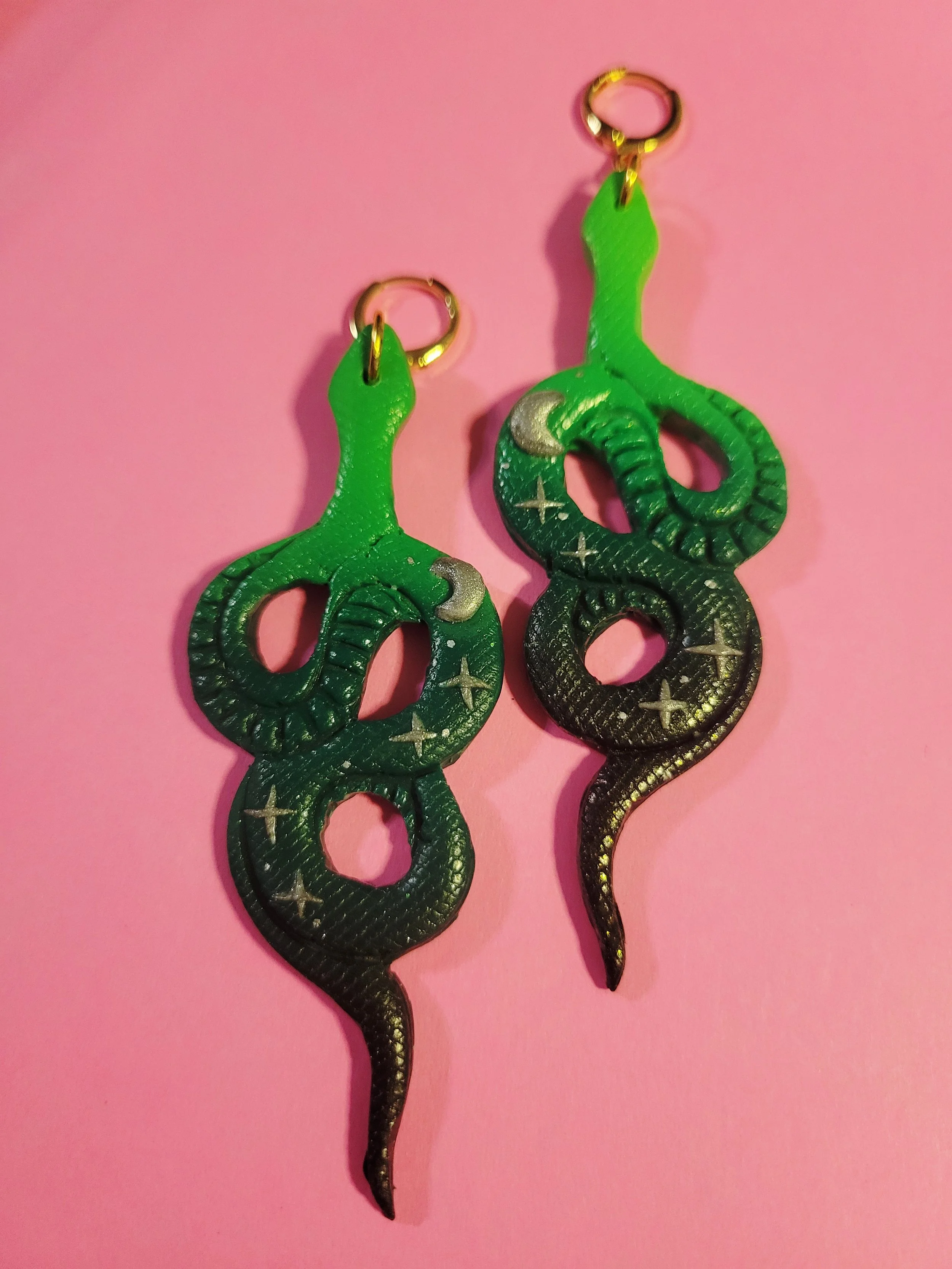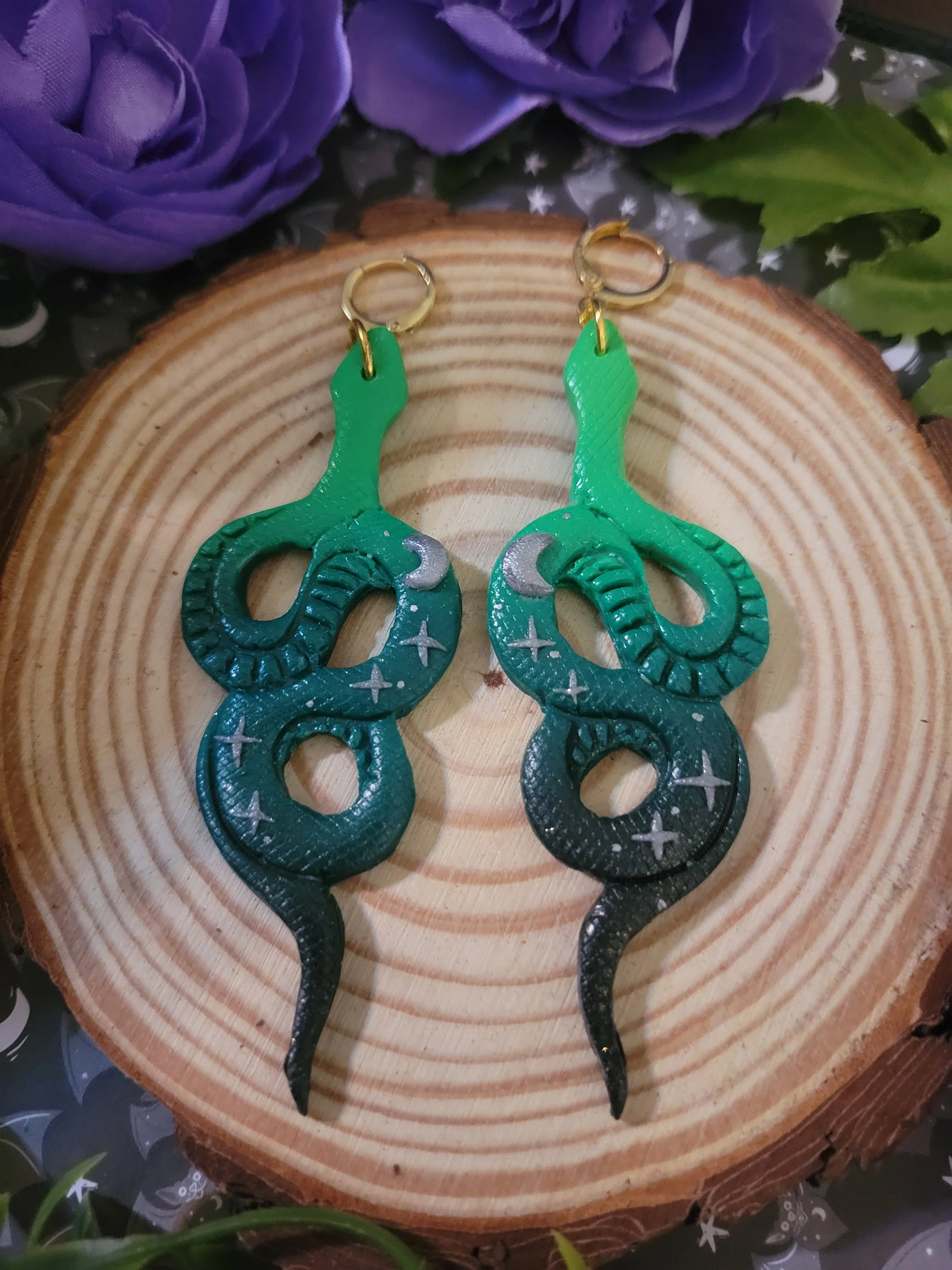 These snake earrings are extra long (80mm x30mm at the longest and widest points) and are scale textured with a gradient that goes from black to emerald green and silver moon and star details.